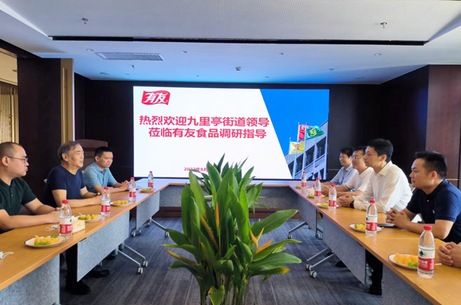 有友食品董事长鹿有忠对九里亭街道领导的到来表示热烈欢迎,感谢街道领导对有友食品的关心和支持。鹿有忠详细介绍了有友食品的发展历程,有友食品于2022年2月投资成立上海有友食品有限公司,在巩固西南地区市场的基础上,大力拓展以宁沪杭为核心的华东市场;于2022年6月投资成立杭州有友食品销售有限公司,独立电商渠道的运营管理,打造符合线上渠道特点和消费习惯的产品矩阵。有友食品先后投入数千万元在上海、杭州购置办公楼、设立子公司,经多年技术沉淀,储备数十个预制菜品种,期待以预制菜为抓手,全力拓展华东市场,为公司下一步的发展带来新的突破口。